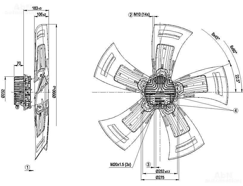Тип: вентилятор осевой; Количество лопастей: 5; Двигатель: M3G150-FF; Количество фаз: 1; Тип напряжения: AC; Номинальное напряжение, V: 230; Скорость, min-1: 820; Степень защиты: IP 55; Температура эксплуатации, С: -40…80