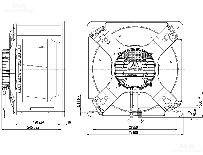 Тип: вентилятор центробежный; Количество лопастей: 7; Двигатель: M3G112-EA; Количество фаз: 3; Тип напряжения: AC; Номинальное напряжение, V: 400; Скорость, min-1: 2900; Степень защиты: IP 55; Температура эксплуатации, С: -40…80
