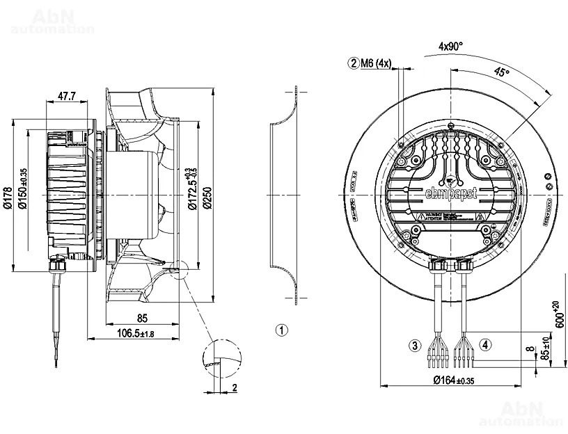 Тип: вентилятор центробежный; Количество лопастей: 7; Двигатель: M3G084-DF; Количество фаз: 1; Тип напряжения: AC; Номинальное напряжение, V: 230; Скорость, min-1: 3740; Степень защиты: IP 55; Температура эксплуатации, С: -40…80