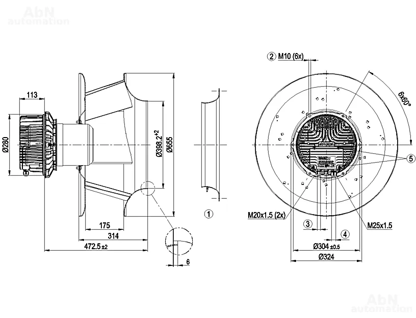 Тип: вентилятор центробежный; Количество лопастей: 5; Двигатель: M3G150-NA; Количество фаз: 3; Тип напряжения: AC; Номинальное напряжение, V: 400; Скорость, min-1: 1760; Степень защиты: IP 55; Температура эксплуатации, С: -40…80