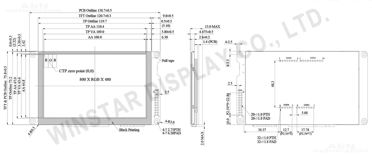Тип: дисплей; Разрешение дисплея, px: 800*480; Тип дисплея: TFT; Температура эксплуатации, С: -20…70; Покрытие поверхности: глянцевое